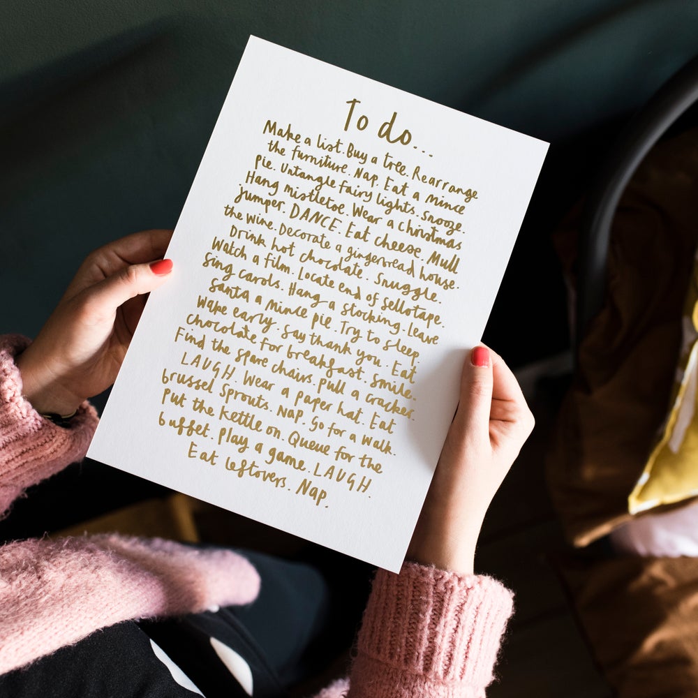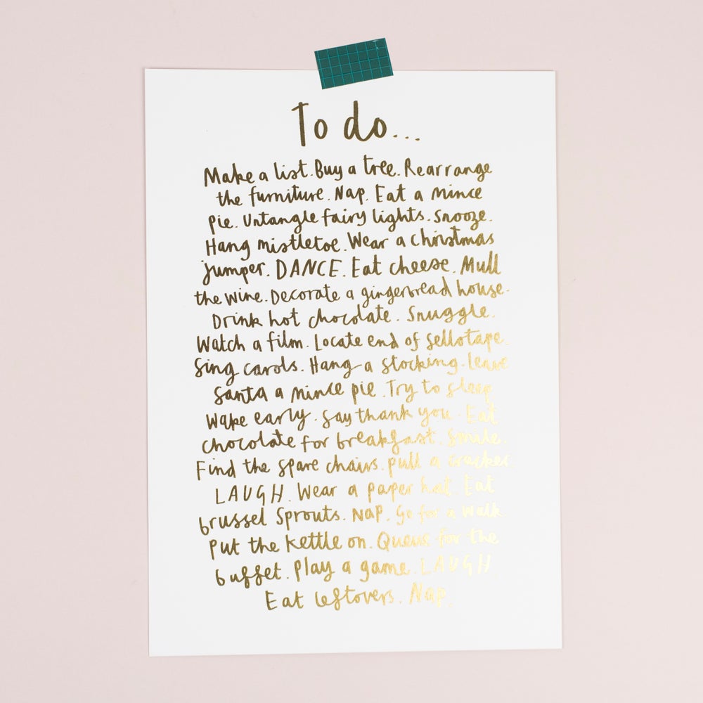 This print features the perfect Christmas to do list, with not a chore in sight. This list is made up of fun things to do on your own or with family or friends including untangle fair lights and decorate a gingerbread house. One to bring out year after year after year. The print is extra special as very single word has been gold foiled making it super shiny and christmassy!