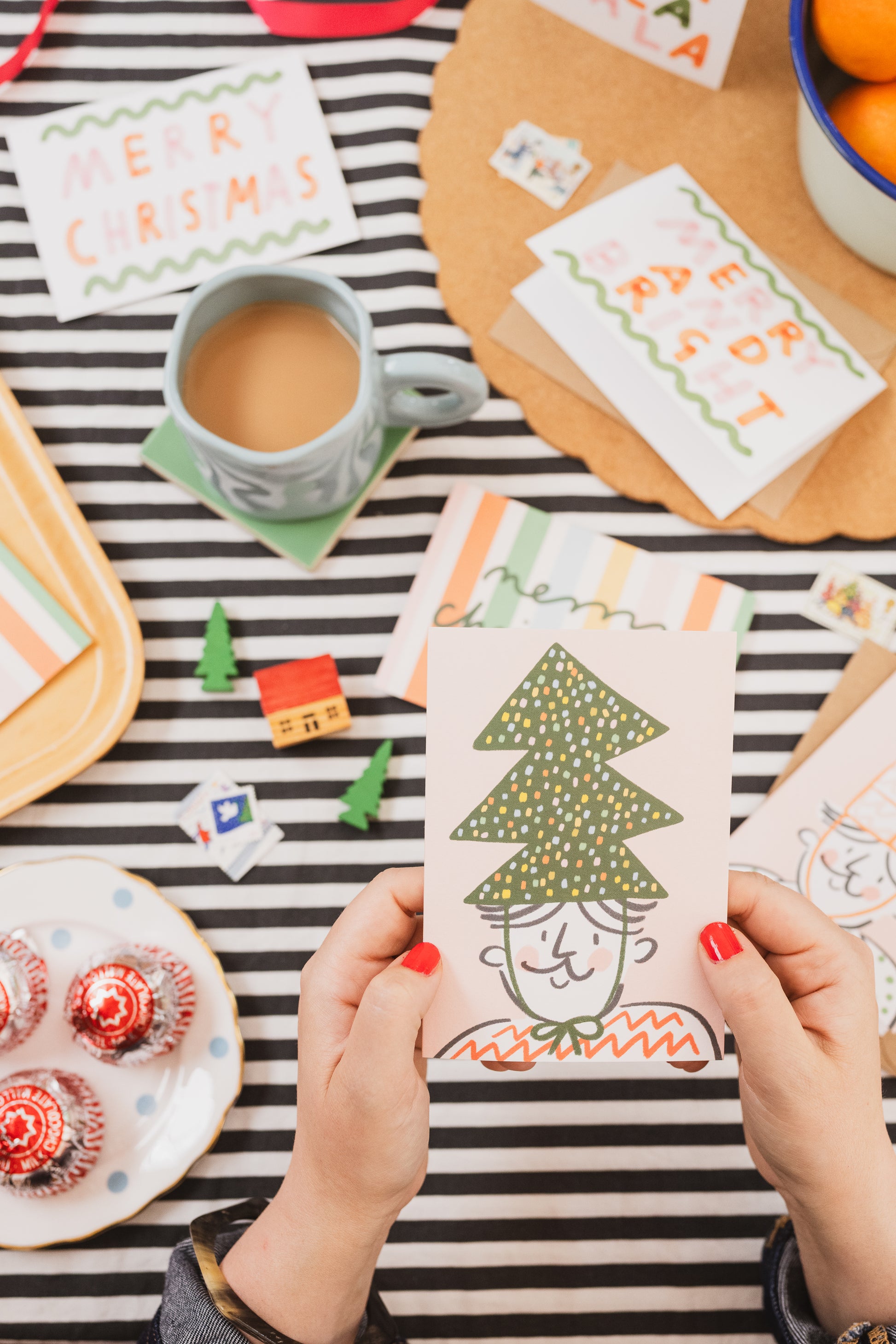 - Designed and printed in Nottingham, Uk. - A fun Christmas card featuring a happy man wearing his Christmas tree hat. A fun Christmas card that is bound to make the recipient smile!