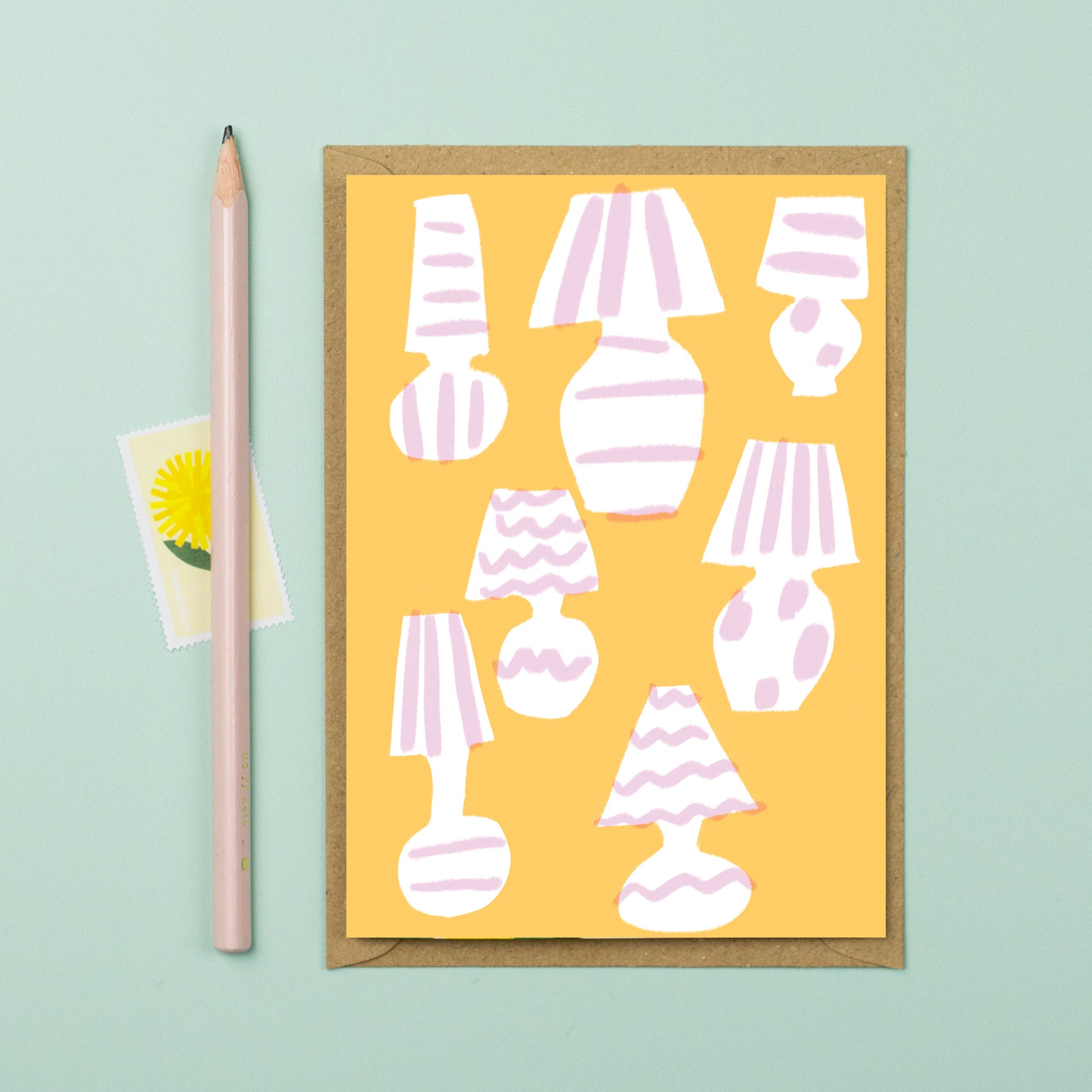 A sweet card featuring illustrations of lamps with a lilac lamps on a green background. This blank card would be great to mark any occasion, or could be used as a new home card.